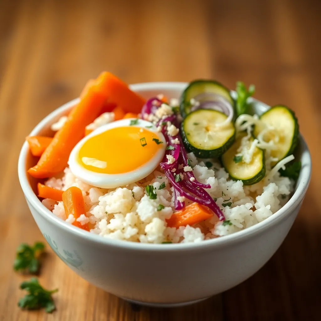 Start your day with a nutritious and vibrant rice bowl filled with sautéed vegetables, fluffy eggs, and melted cheese, all layered over a bed of wholesome white rice.