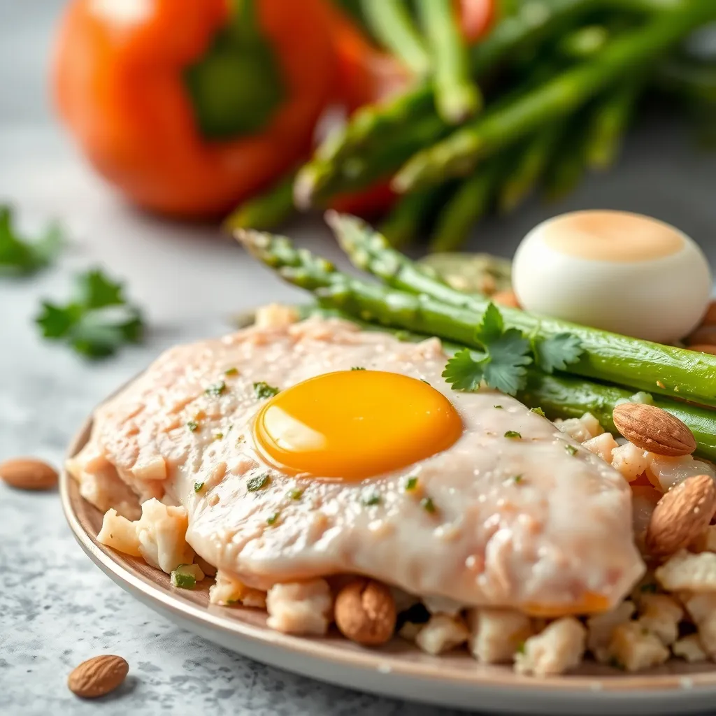 A vibrant and quick Mediterranean dish featuring tender chicken breast, crisp asparagus, and colorful bell peppers, all brought together with a touch of butter and topped with crunchy almonds.